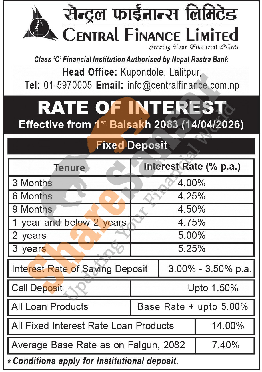Central Finance Limited has published a notice regarding the new interest rate for deposit and loan products and it's effective from 1st Baisakh, 2083.