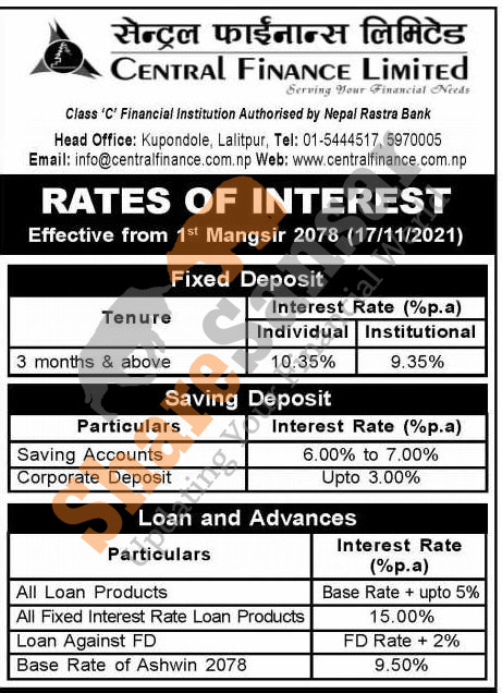 Central Finance Limited has published a notice regarding the new interest rate for deposit and loan products and it's effective from 1st Mangsir, 2078.