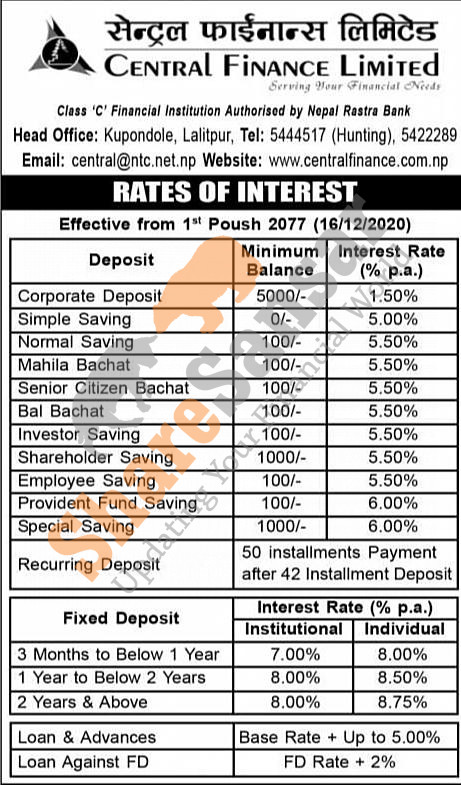 Central Finance Limited has published a notice regarding the new interest rate for its deposit and loan products and it's effective from 1st Poush, 2077.