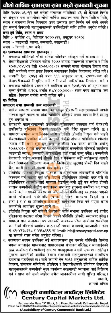 Century Capital Markets Limited has announced its 4th AGM going to be held on 6th Kartik, 2077.
