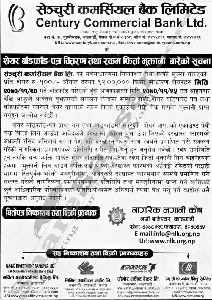 Century Commercial Bank Limited has allotted 92,00,000 units IPO share to the general public on 20th Falgun, 2070 and is refunding money to the non-allottee investors from 25th Falgun, 2070.