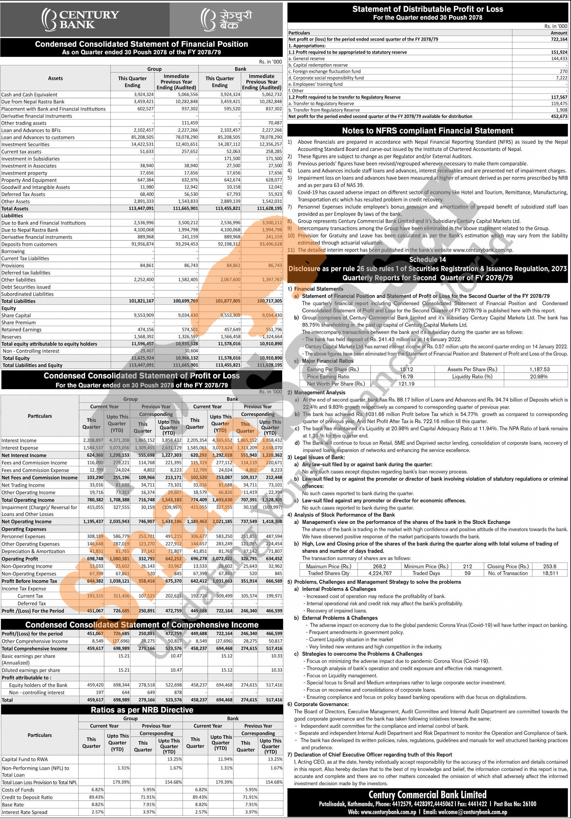 Century Commercial Bank Limited has posted a net profit of Rs 722.16 million and published its 2nd quarter company analysis of the fiscal year 2078/79.