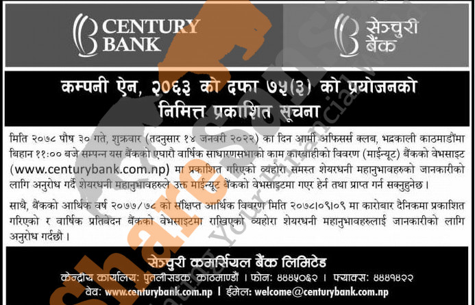 Century Commercial Bank Limited has published a notice regarding availability of its AGM minutes and financial reports on its official website.