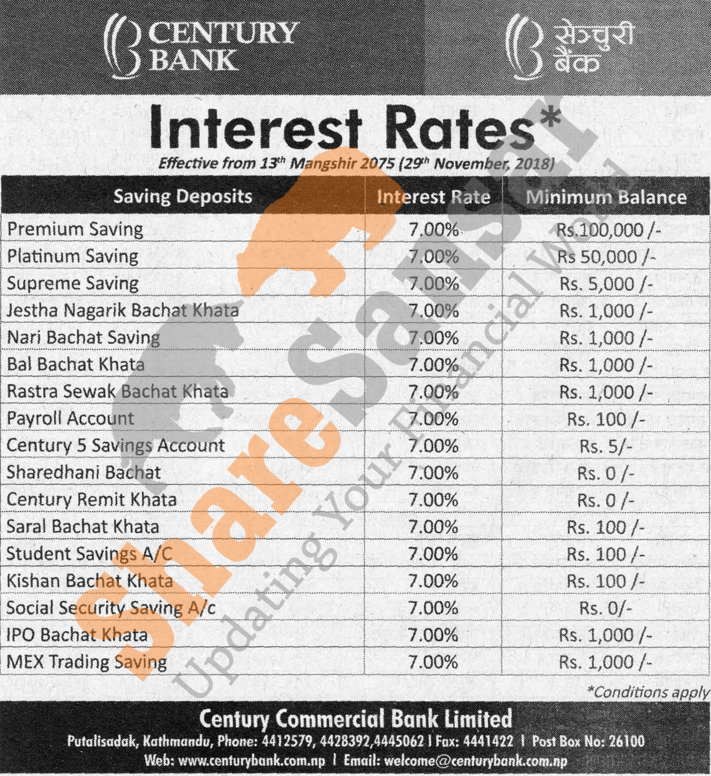 Century Commercial Bank Limited has published a notice regarding new interest rate and its effective from 13th Mangsir, 2075.