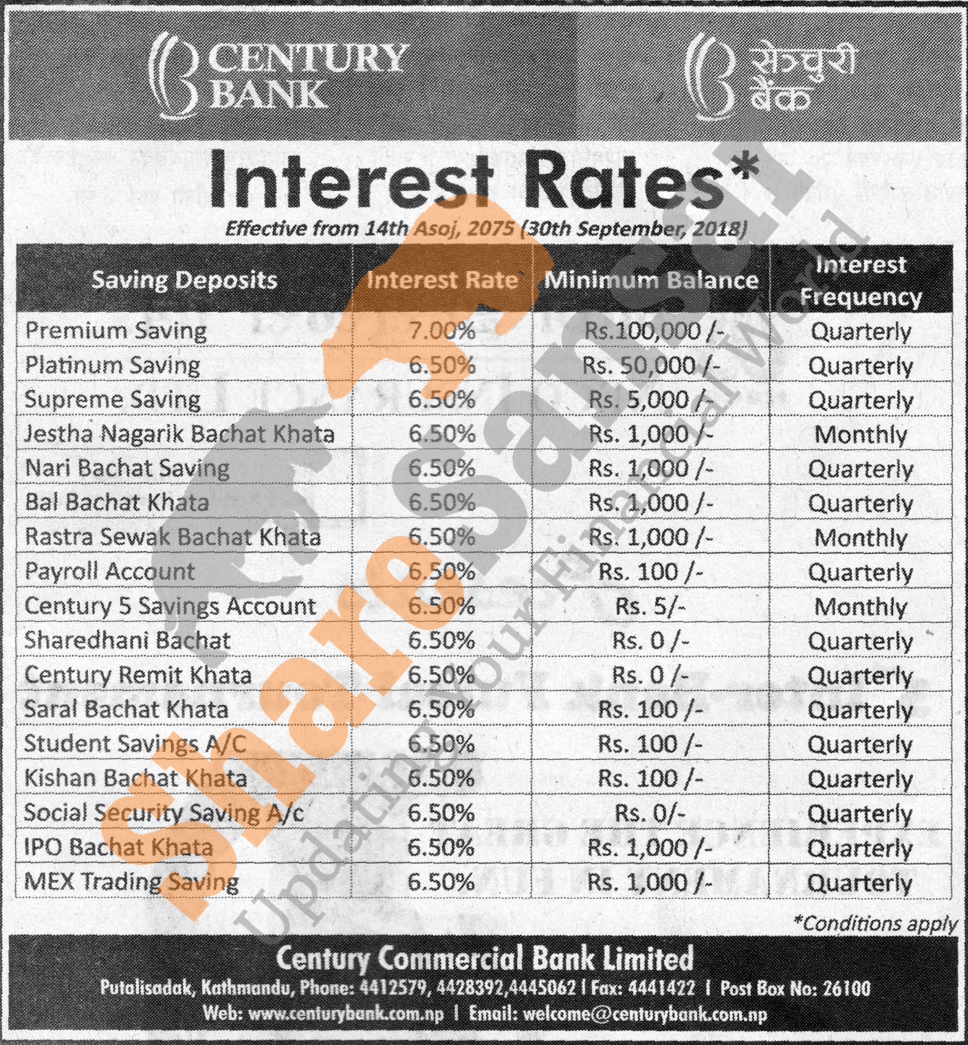 Century Commercial Bank Limited has published a notice regarding new interest rate and its effective from 14th Ashwin, 2075.