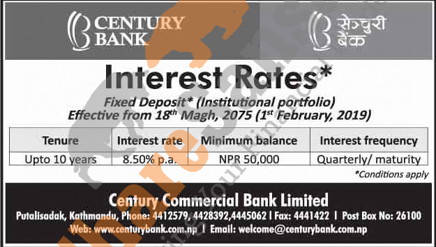 Century Commercial Bank Limited has published a notice regarding new interest rate and its effective from 18th Magh, 2075.