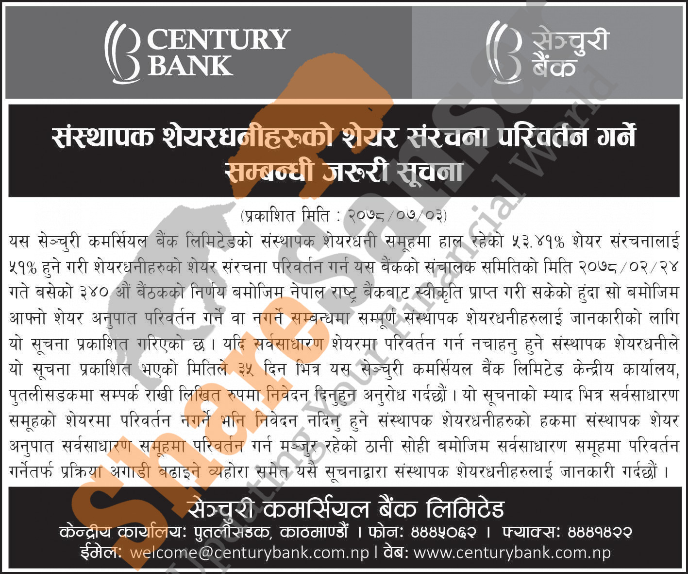 Century Commercial Bank Limited has published a notice regarding the conversion of promoter share structure from 53.41% to 51%.