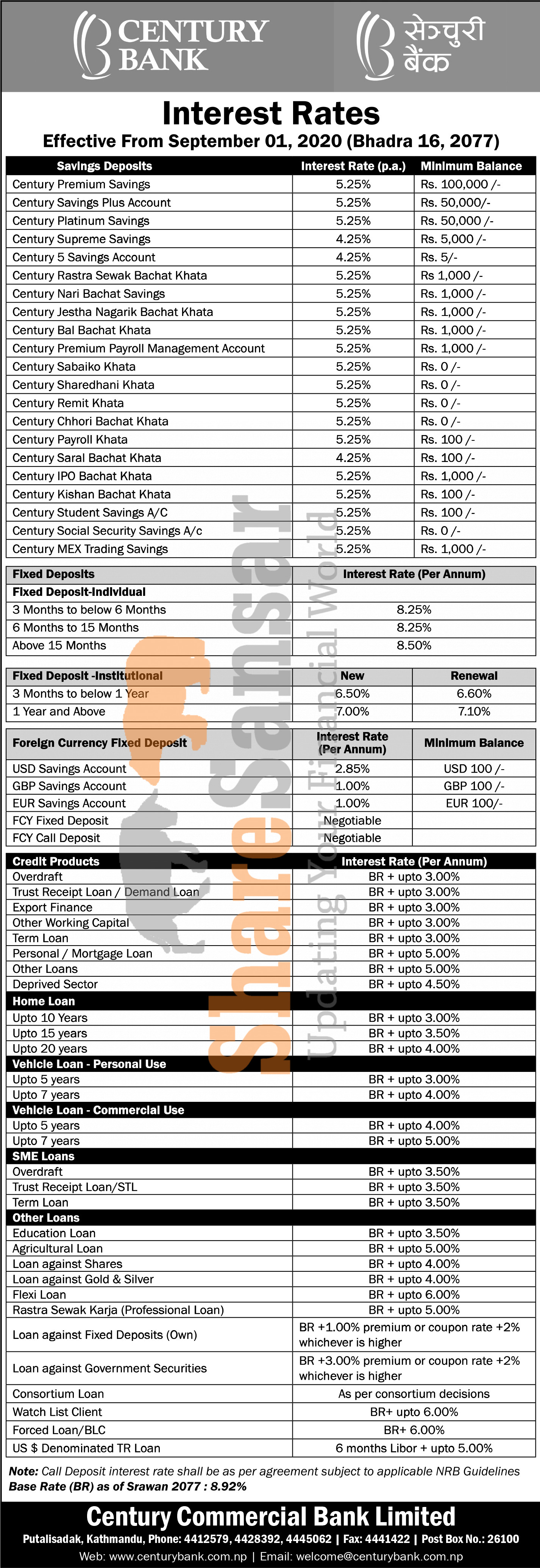 Century Commercial Bank Limited has published a notice regarding the new interest rate for its deposit and loan products and its effective from 16th Bhadra, 2077.