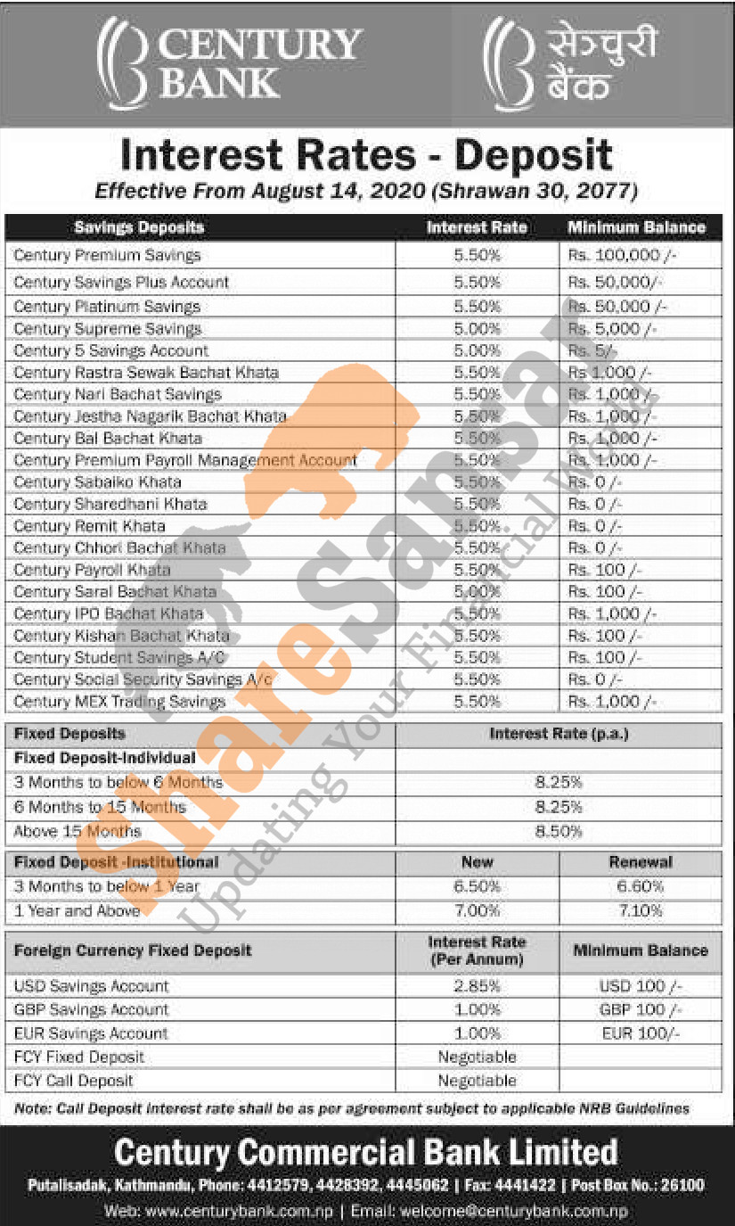 Century Commercial Bank Limited has published a notice regarding the new interest rate for its deposit products and its effective from 30th Shrawan, 2077.