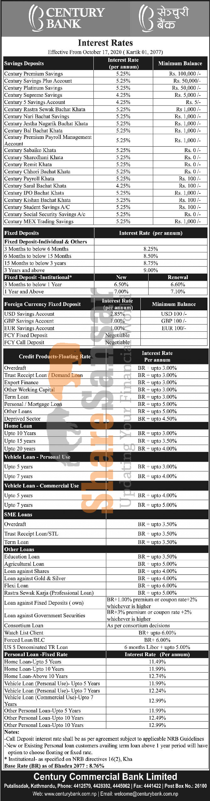 Century Commercial Bank Limited has published a notice regarding the new interest rate for its loan and deposit products and it's effective from 1st Kartik, 2077.
