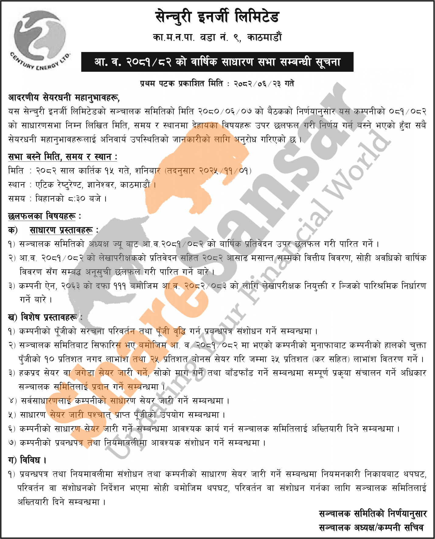 Century Energy Limited has announced its AGM going to be held on 15th Kartik, 2082.