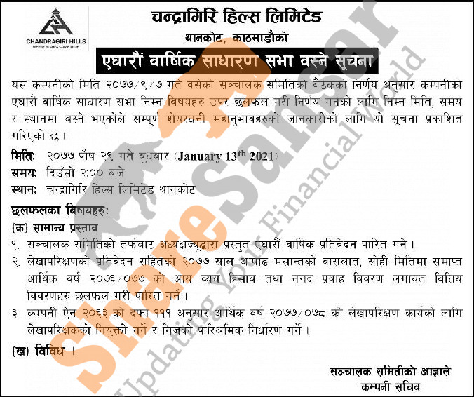 Chandragiri Hills Limited has announced its 11th AGM going to be held on 29th Poush, 2077.