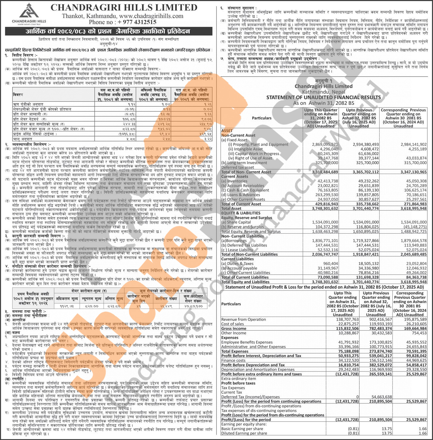 Chandragiri Hills Limited has posted a net loss of Rs 12.43 million and published its 1st quarter company analysis of the fiscal year 2082/83.