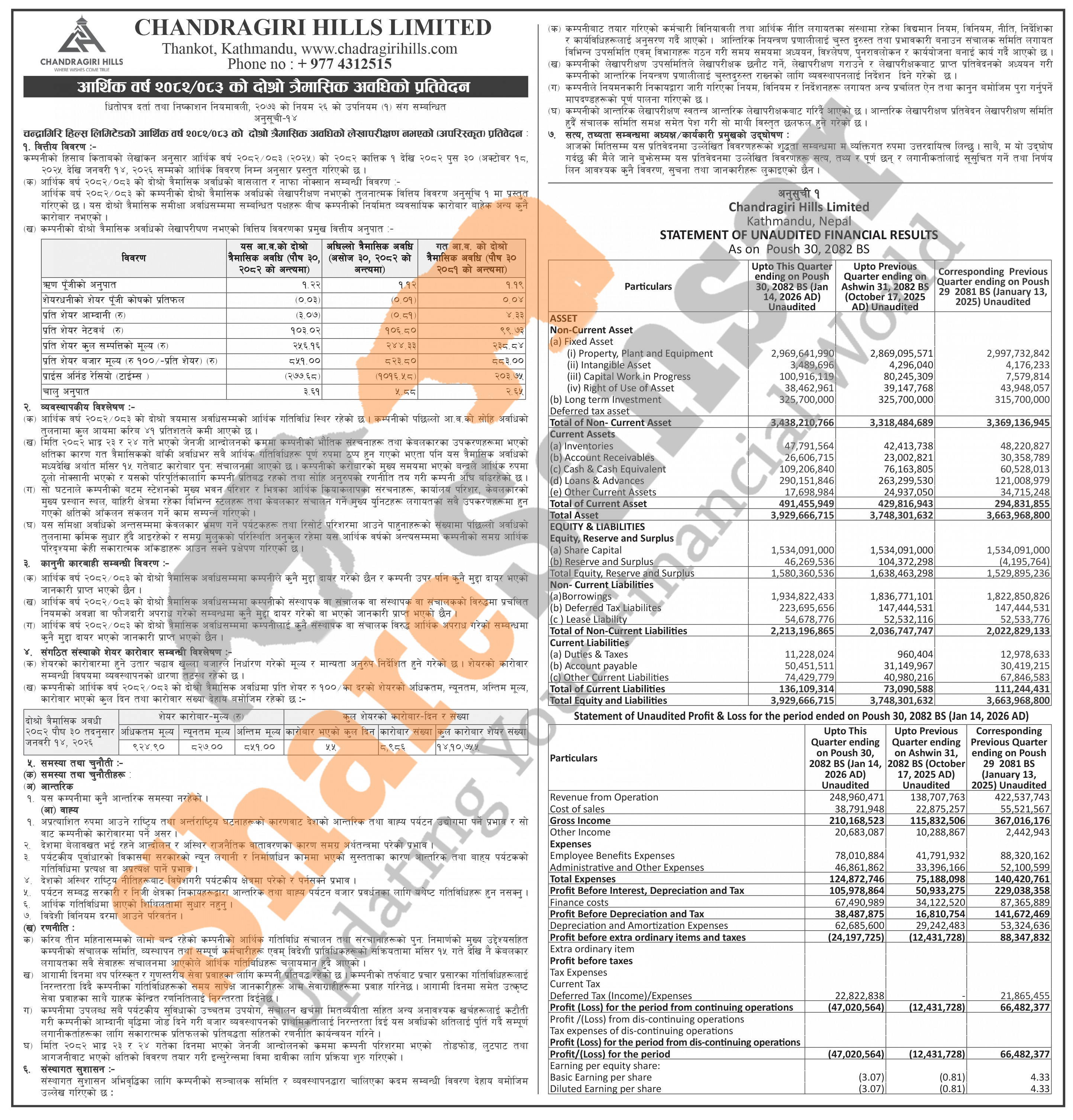 Chandragiri Hills Limited has posted a net loss of Rs 47.02 million and published its 2nd quarter company analysis of the fiscal year 2082/83.