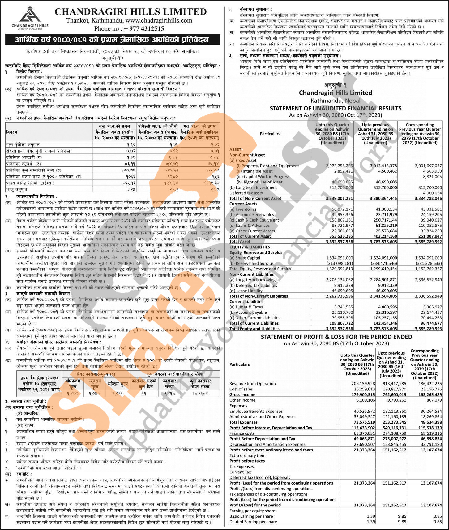 Chandragiri Hills Limited has posted a net profit of Rs 21.37 million during the 1st quarter of the fiscal year 2080/81.