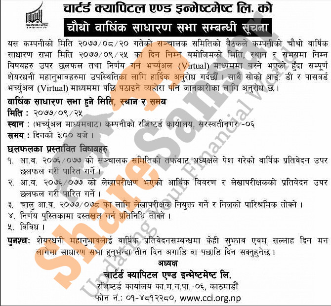 Chartered Capital and Investment Limited has announced its 4th AGM going to be held on 25th Poush, 2077.