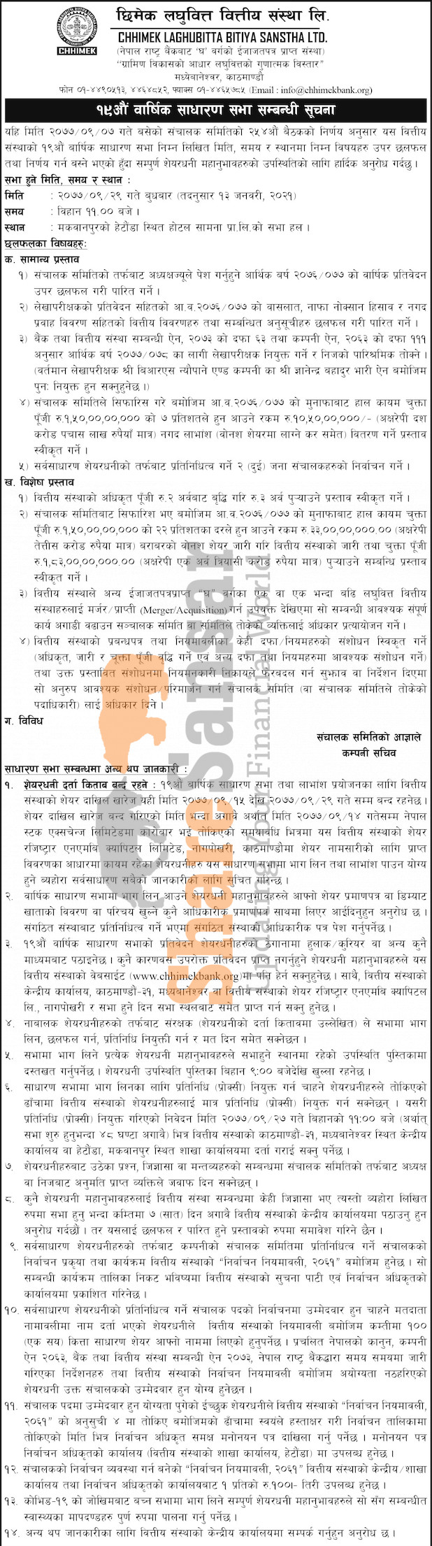 Chhimek Laghubitta Bittiya Sanstha Limited has announced its 19th AGM going to be held on 29th Poush, 2077.