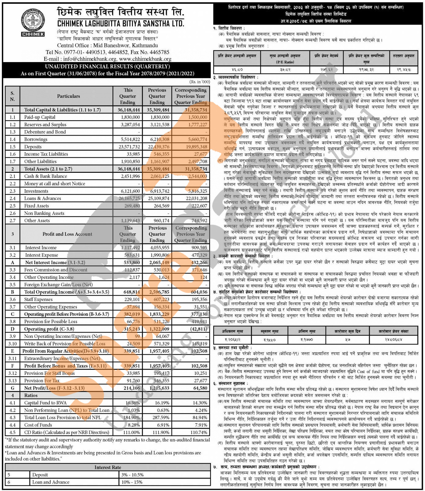 Chhimek Laghubitta Bittiya Sanstha Limited has posted a net profit of Rs 214.10 million and published its 1st quarter company analysis of the fiscal year 2078/79.