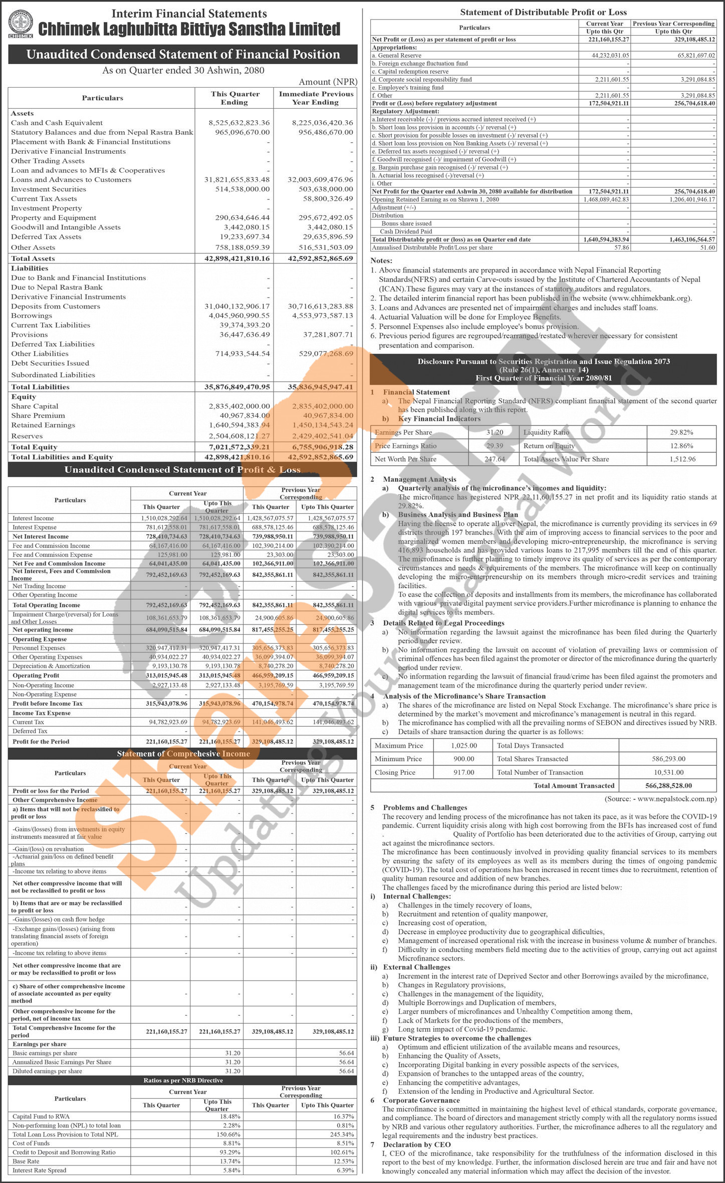 Chhimek Laghubitta Bittiya Sanstha Limited has posted a net profit of Rs 221.16 million during the 1st quarter of the fiscal year 2080/81.