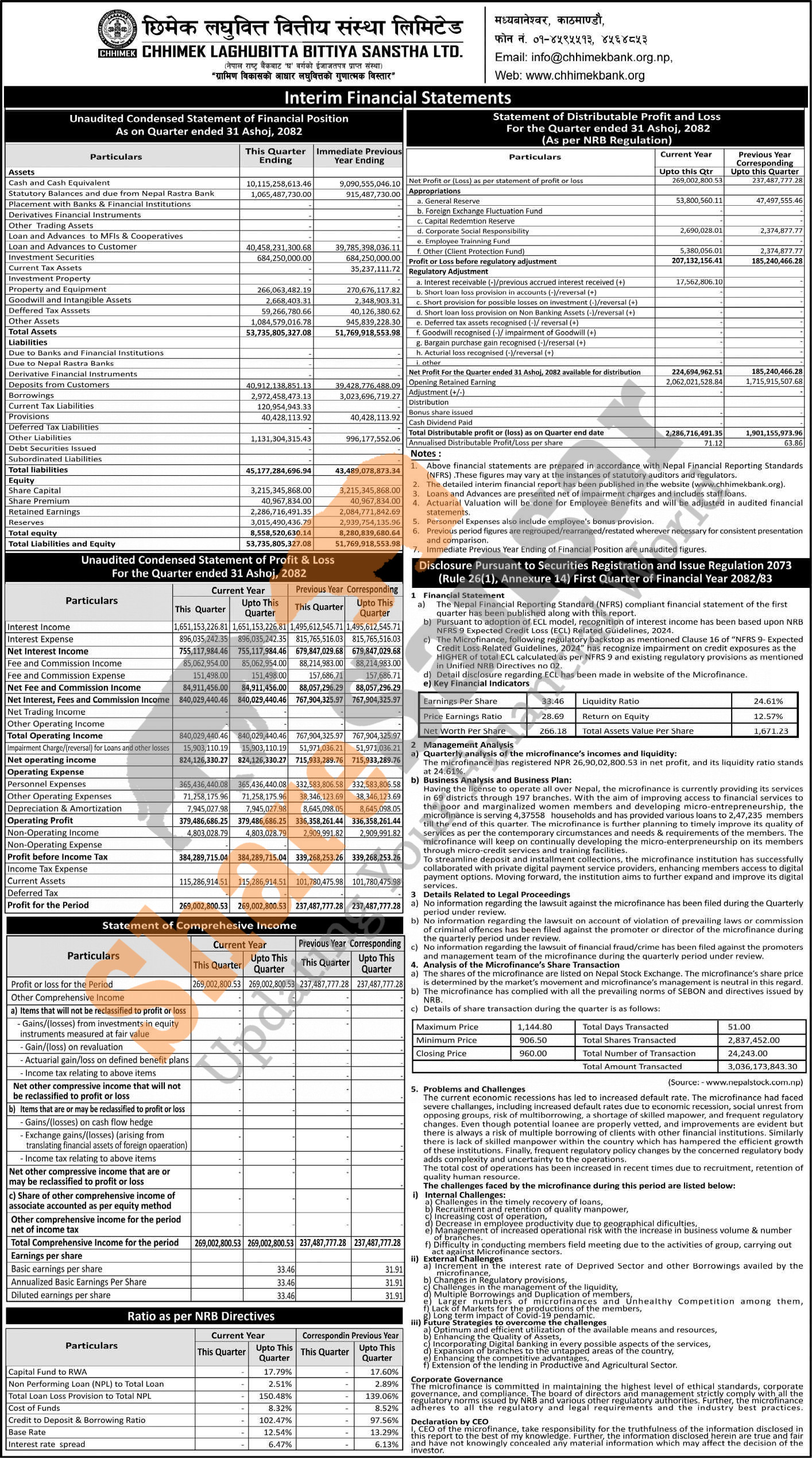 Chhimek Laghubitta Bittiya Sanstha Limited has posted a net profit of Rs 269 million and published its 1st quarter company analysis of the fiscal year 2082/83.