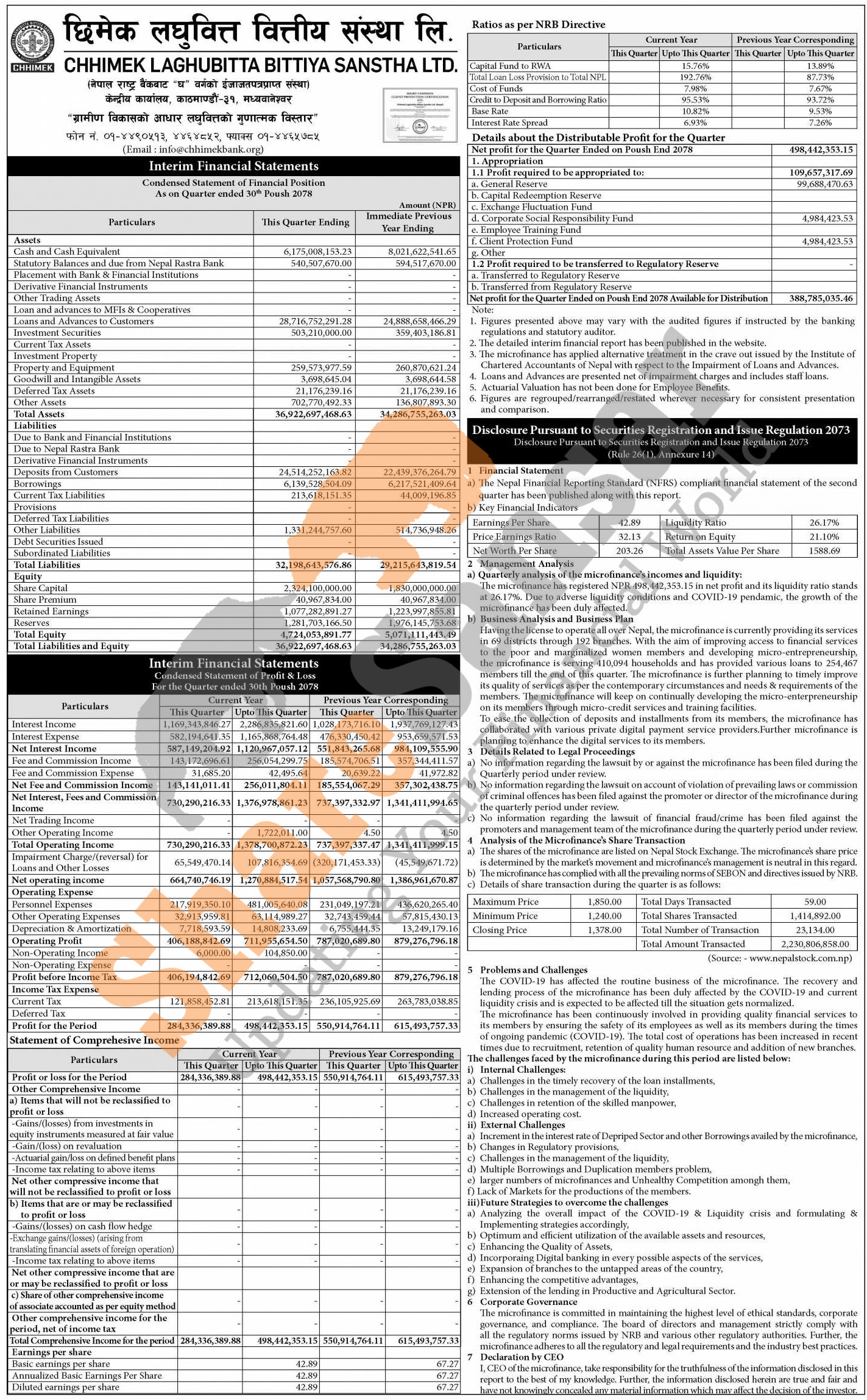 Chhimek Laghubitta Bittiya Sanstha Limited has posted a net profit of Rs 498.44 million and published its 2nd quarter company analysis of the fiscal year 2078/79.