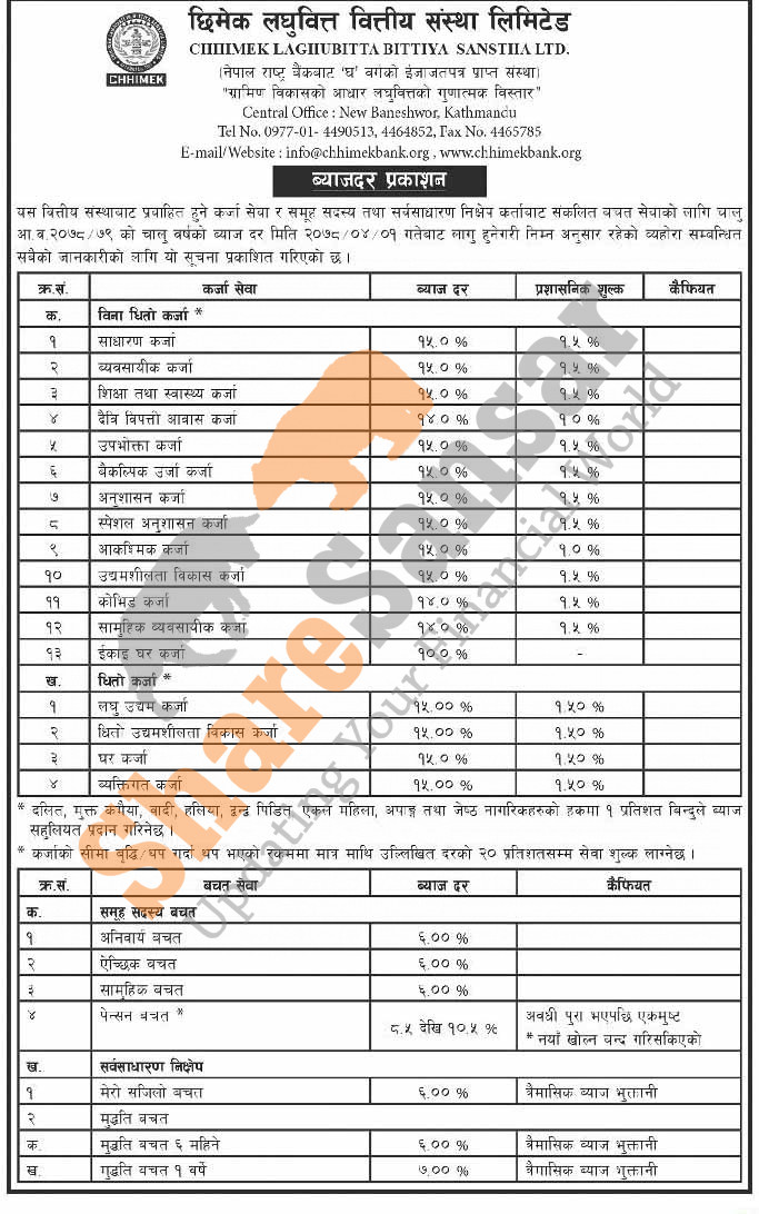 Chhimek Laghubitta Bittiya Sanstha Limited has published a notice regarding the new interest rate for its deposit and loan products and its effective from 1st Bhadra, 2078.