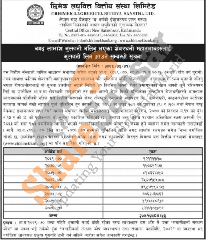 Chhimek Laghubitta Bittiya Sanstha Limited has published a notice to collect uncollected due dividend to its shareholders.