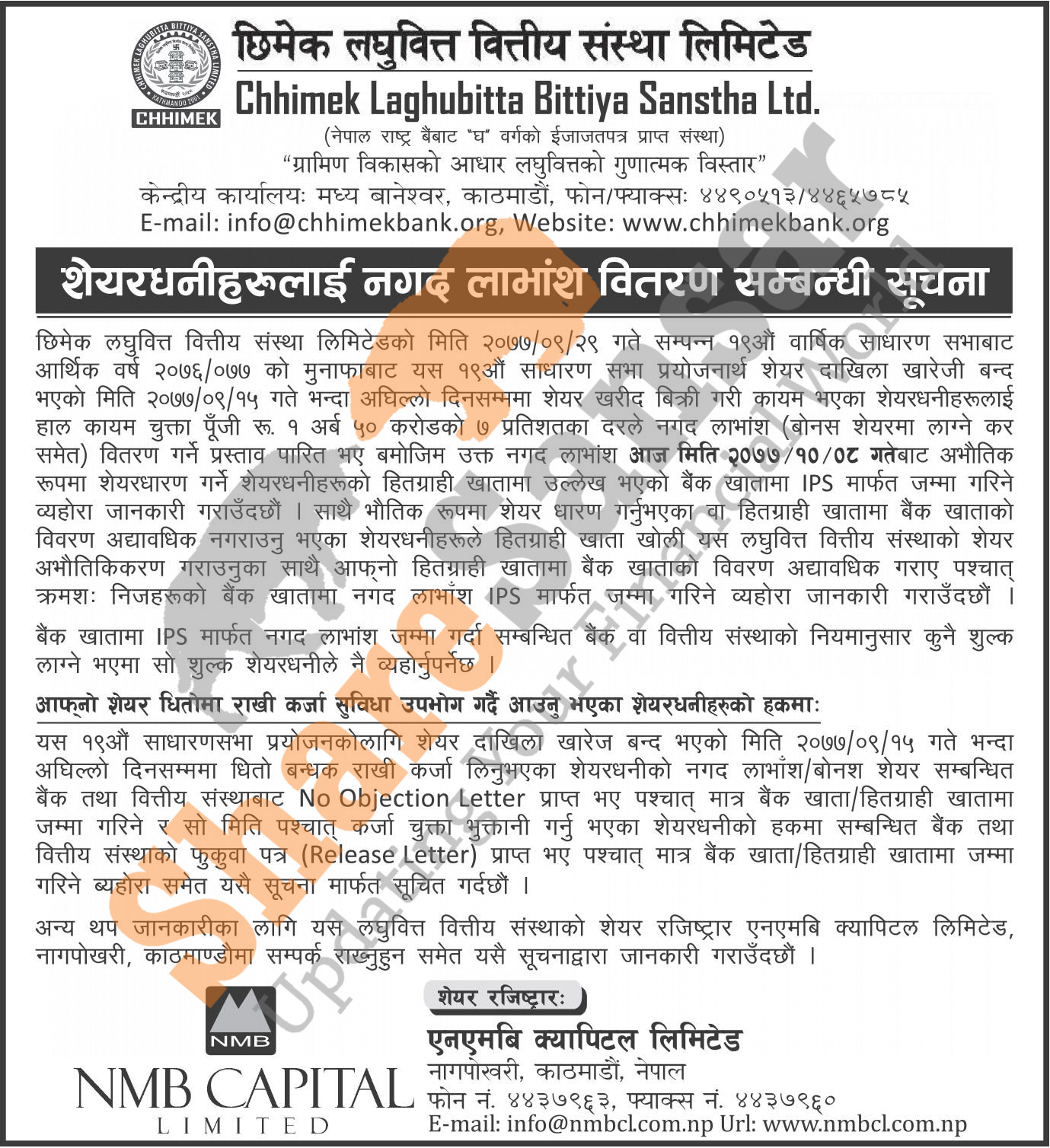 Chhimek Laghubitta Bittiya Sanstha Limited is distributing 7% cash dividend directly to bank accounts and has urged its shareholders to dematerialize their shares.