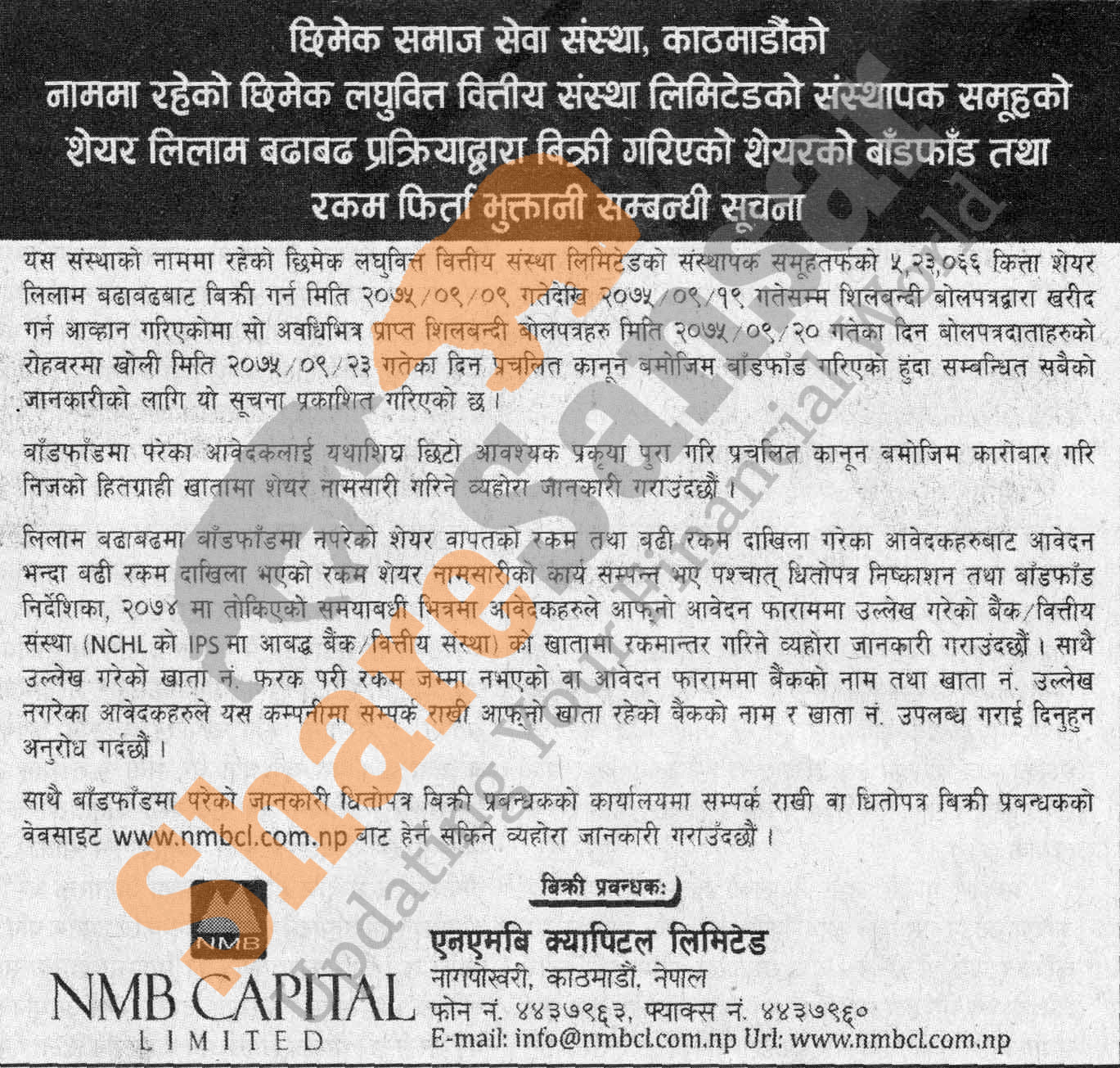 Chhimek Samaj Sewa Sanstha has allotted 5,23,066 units for existing Promoter shares of (Chhimek Laghubitta Bittiya Sanstha Limited) in auction to the general public on 23rd Poush, 2075.