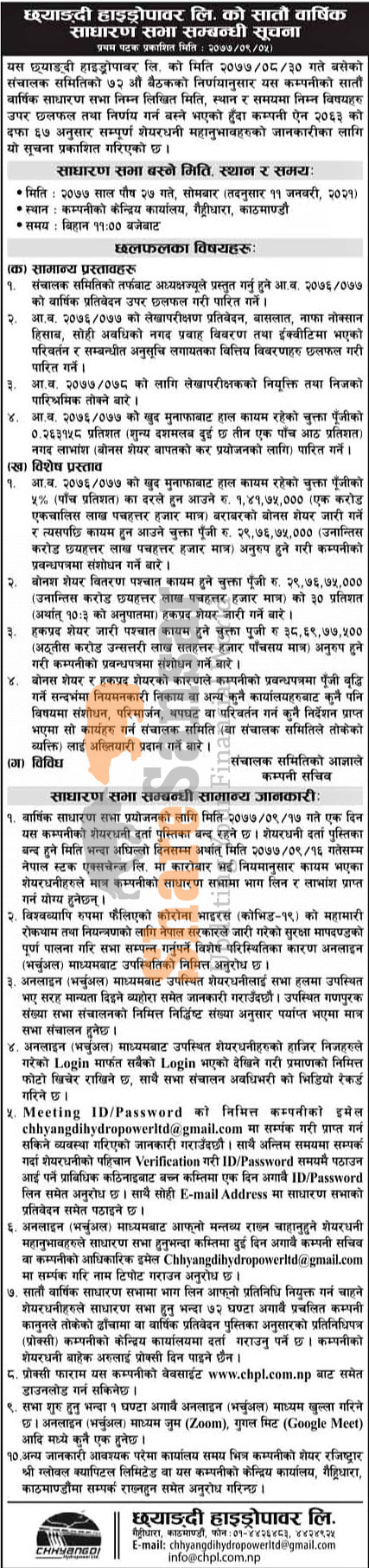 Chhyangdi Hydropower Company Limited has announced its 7th AGM going to be held on 27th Poush, 2077.