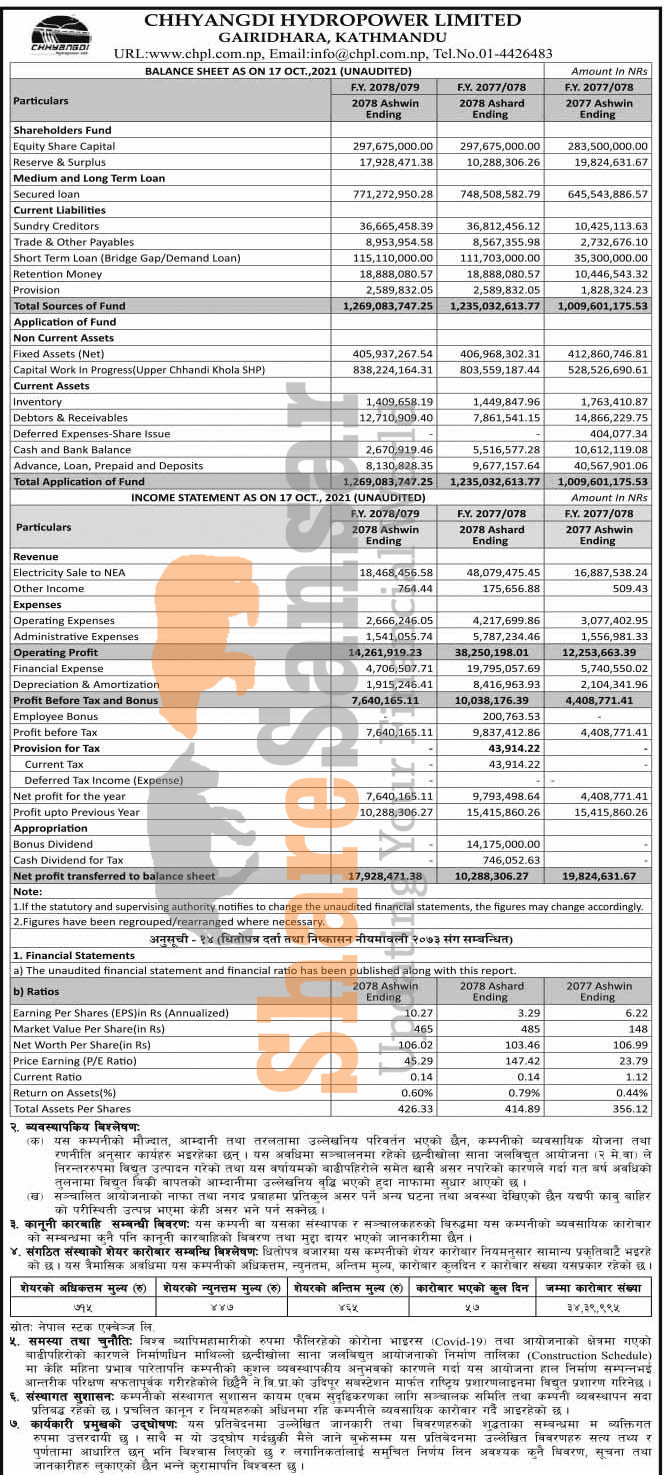Chhyangdi Hydropower Company Limited has posted a net profit of Rs 7.64 million and published its 1st quarter company analysis of the fiscal year 2078/79.