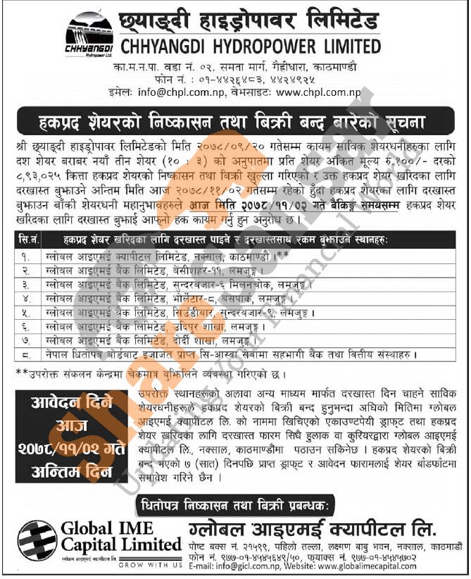 Chhyangdi Hydropower Limited is closing its 10:3 ratio 8,93,025 units right share to its shareholders from 2nd Falgun, 2078 (today).