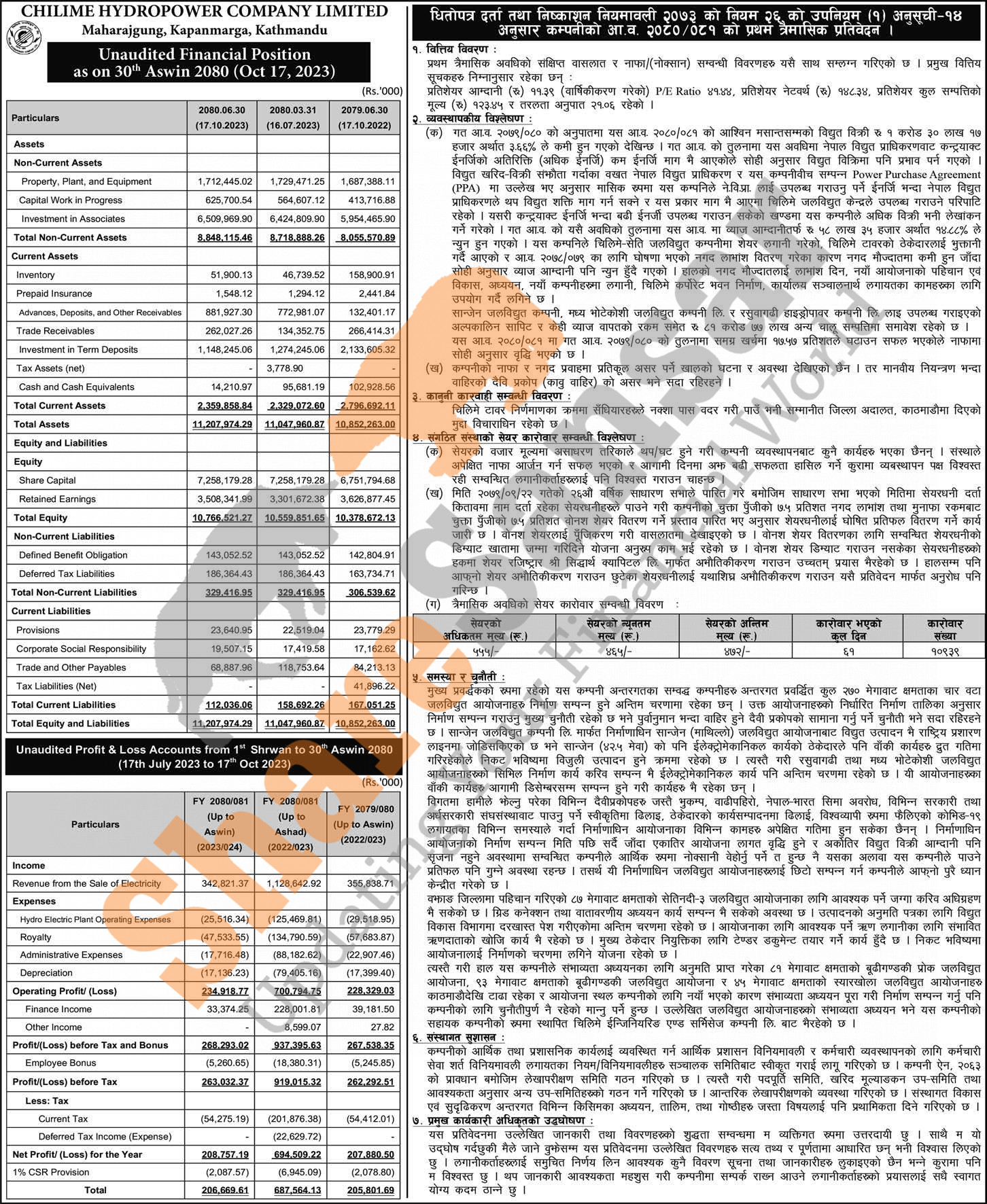 Chilime Hydropower Company Limited has posted a net profit of Rs 208.75 million during the 1st quarter of the fiscal year 2080/81.