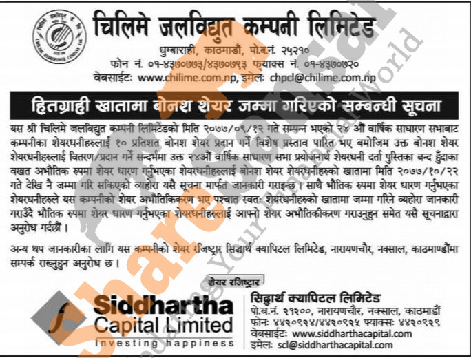 Chilime Hydropower Company Limited is distributing 10% bonus shares directly to DEMAT accounts of its shareholders and has urged to dematerialize their shares.