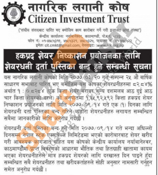 Citizen Investment Trust has announced a book closure date for its upcoming 1:0.8284 ratio right share on 14th Poush, 2077.