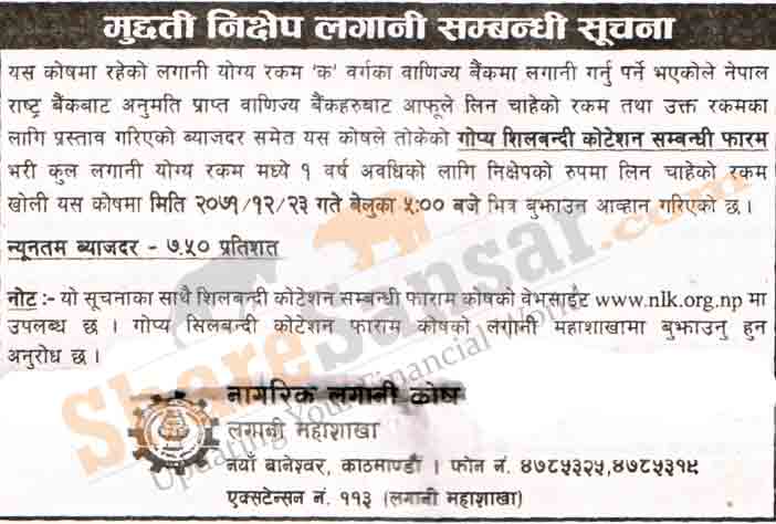 Citizen Investment Trust has published a notice seeking quotation of Fixed Deposit interest.