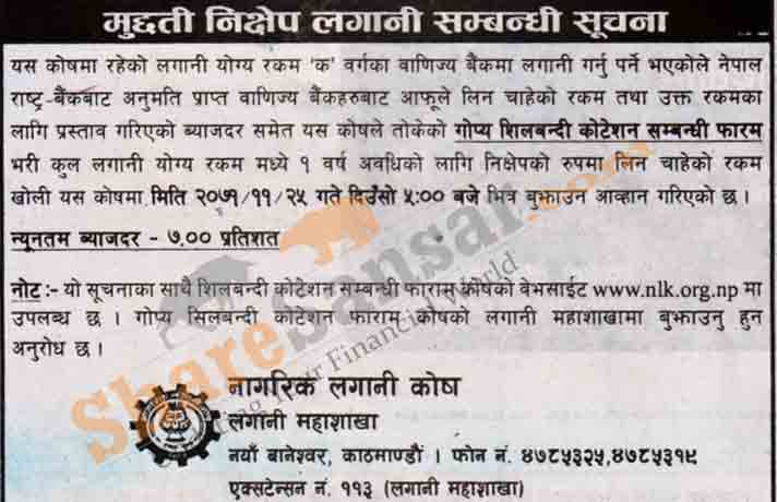 Citizen Investment Trust has published a notice seeking quotation of Fixed Deposit interest.