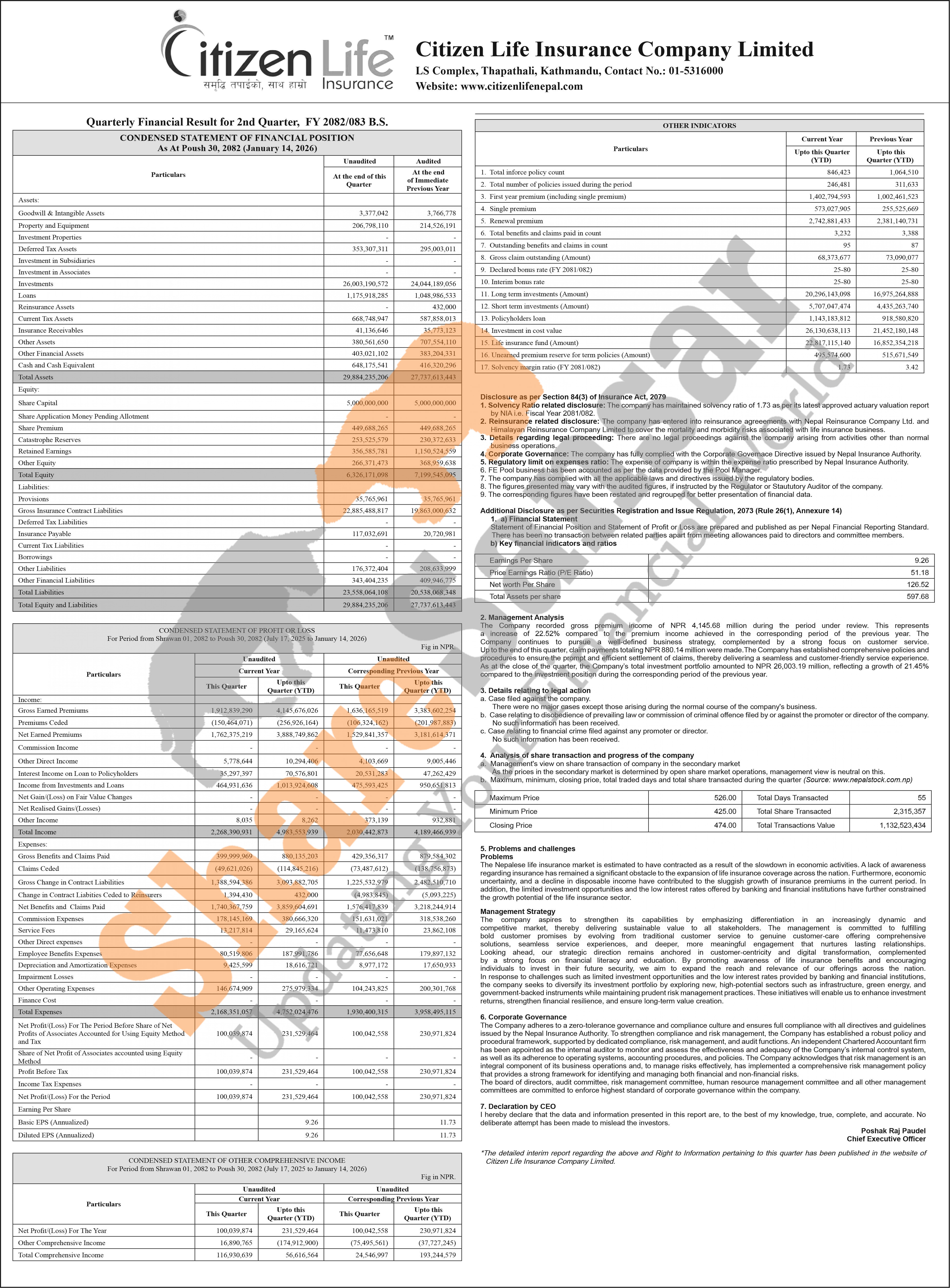 Citizen Life Insurance Company Limited has posted a net profit of Rs 231.52 million and published its 2nd quarter company analysis of the fiscal year 2082/83.