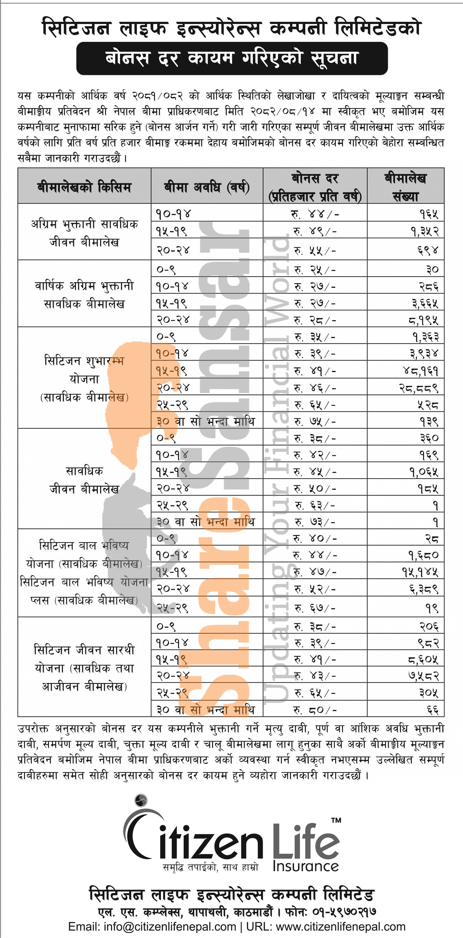 Citizen Life Insurance Company Limited has published a notice regarding a new bonus rate for its different life insurance policies.