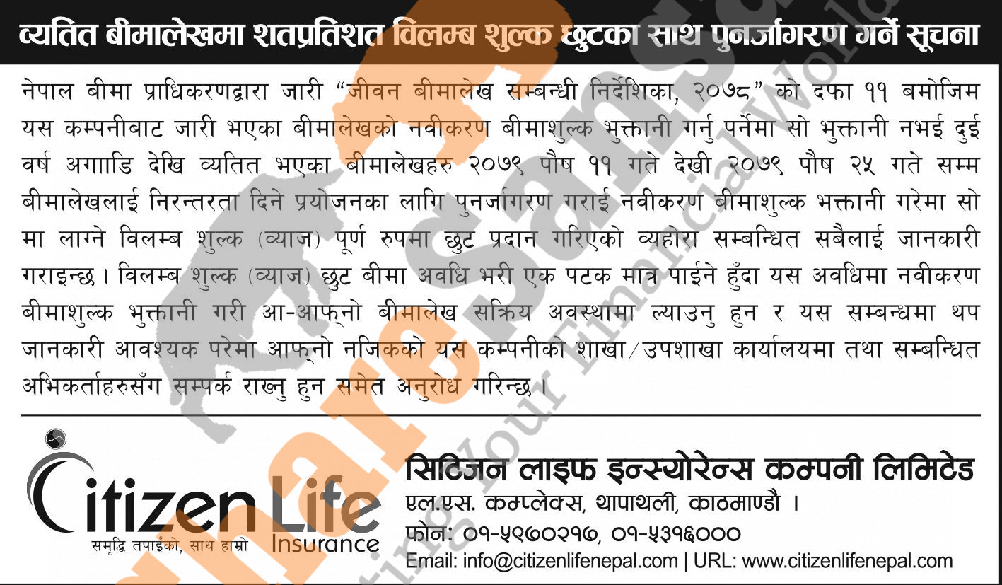 Citizen Life Insurance Company Limited has published a notice to give 100% interest discount on renewal of past insurance policies from 11th Poush to 25th Poush, 2079.