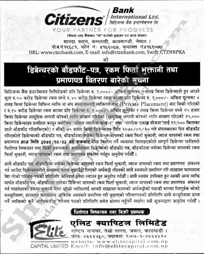 Citizens Bank International Limited has allotted Rs. 500 million Redeemable "8.5% CZBIL Bond 2077" on 23th Poush, 2070 and is distributing advice slip and refunding money to the non-allottee investors from today (3rd Magh, 2070).