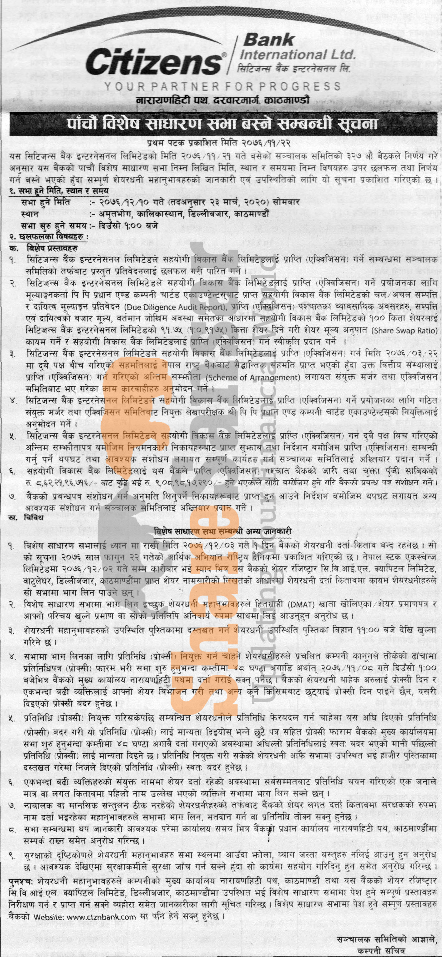 Citizens Bank International Limited has announced its 5th Special General Meeting going to be held on 10th Chaitra, 2076.