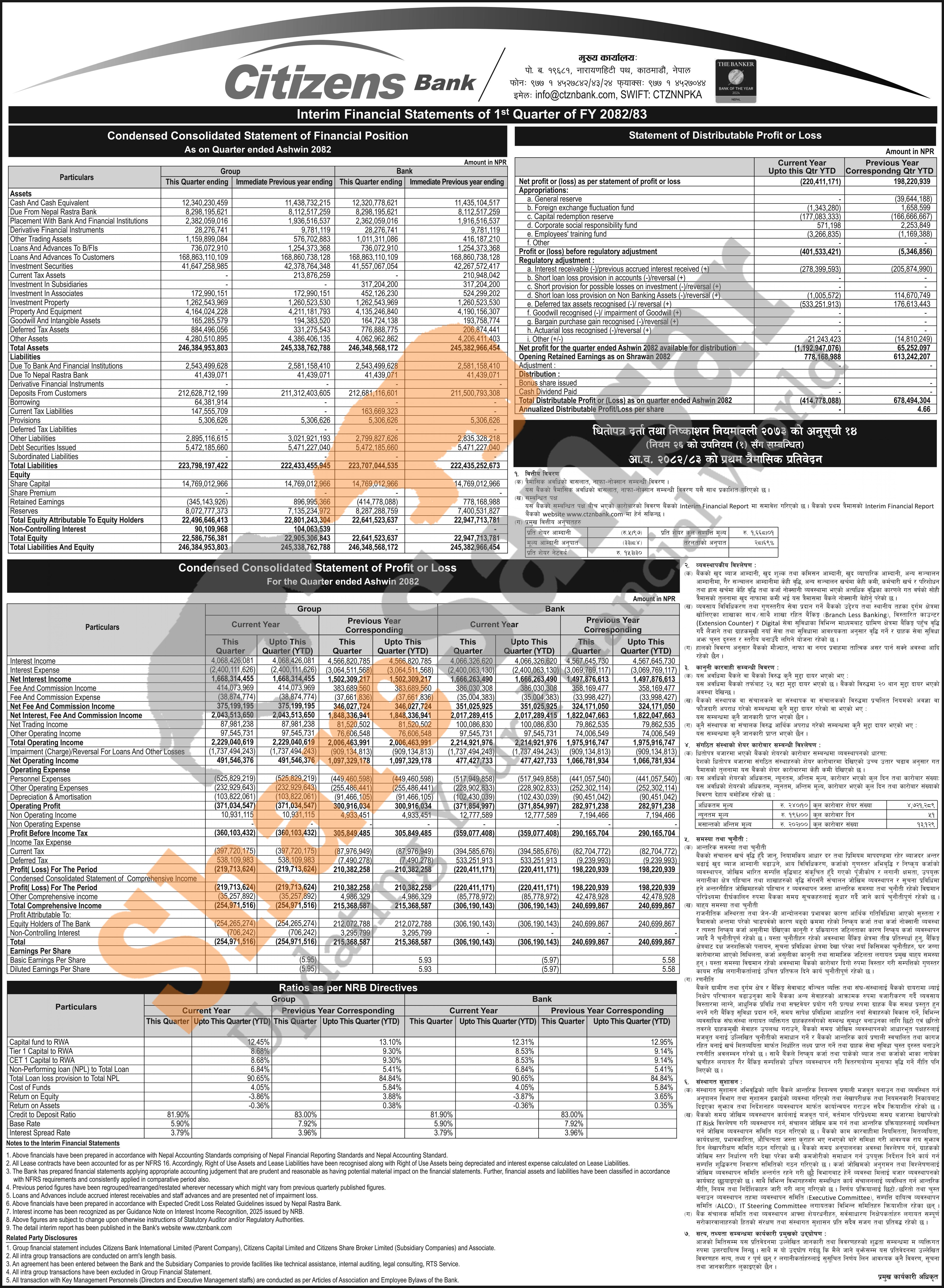 Citizens Bank International Limited has posted a net loss of Rs 220.41 million and published its 1st quarter company analysis of the fiscal year 2082/83.
