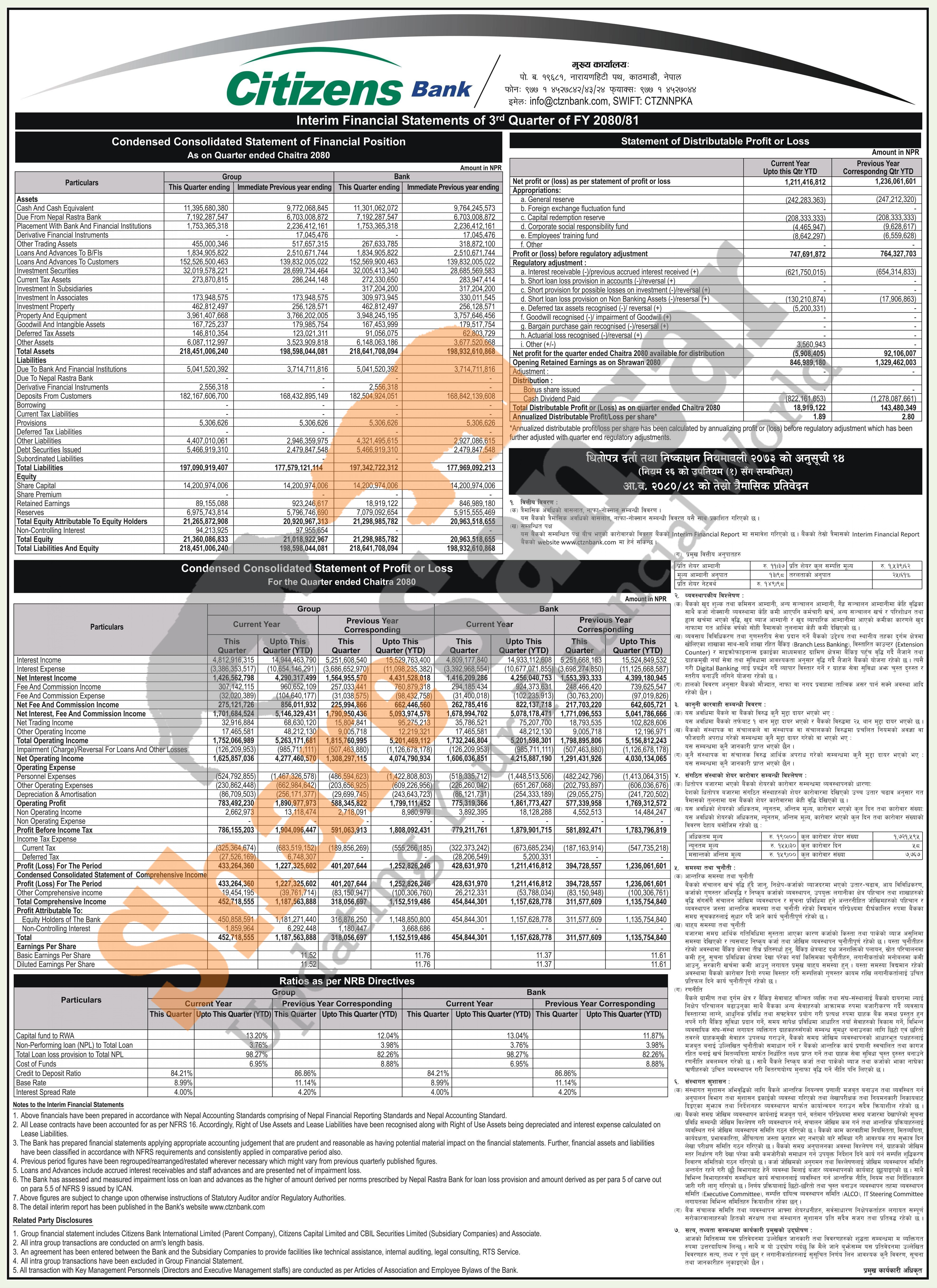 Citizens Bank International Limited has posted a net profit of Rs 1.21 billion and published its 3rd quarter company analysis of the fiscal year 2080/81.