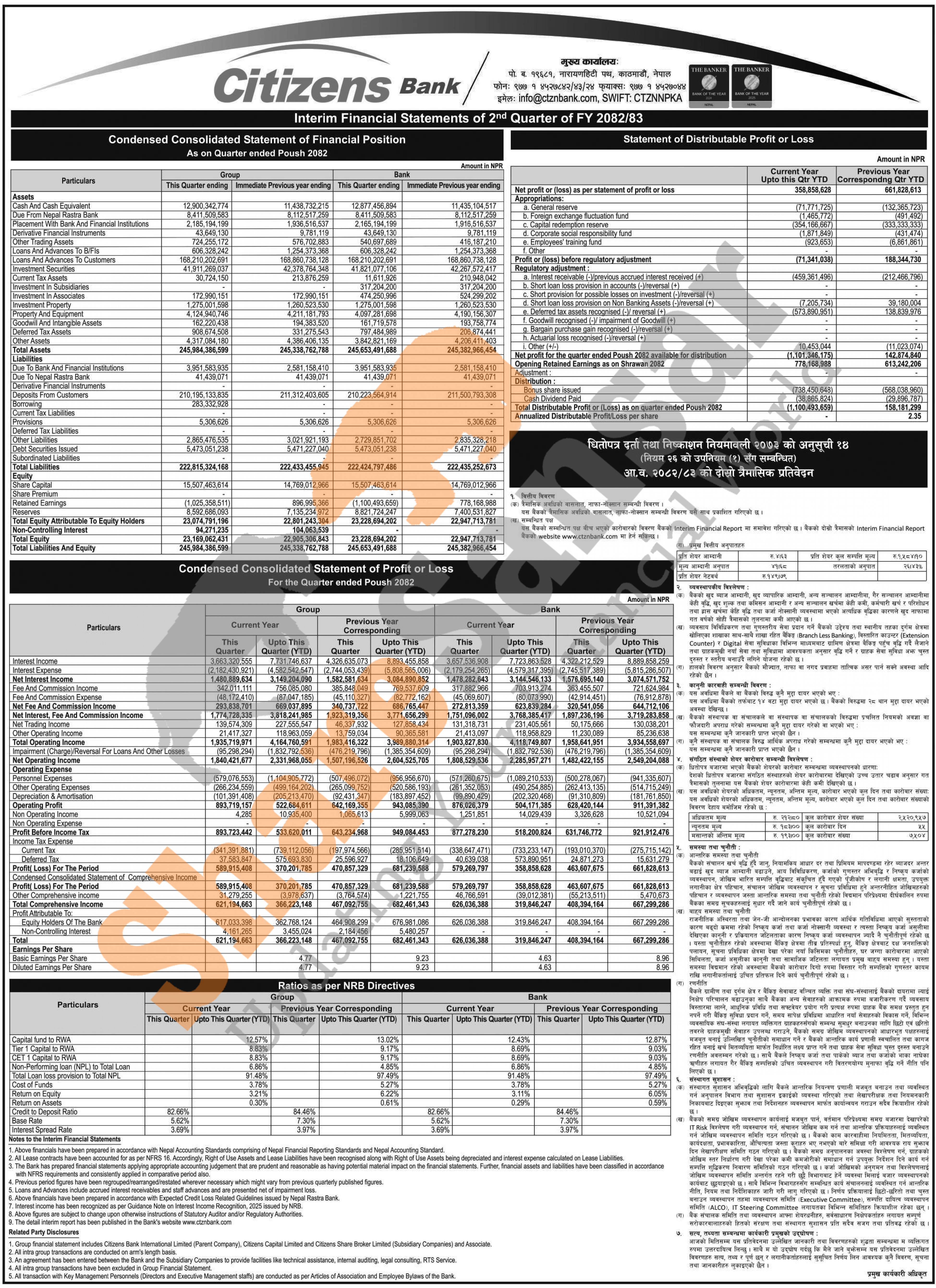 Citizens Bank International Limited has posted a net profit of Rs 358.85 million and published its 2nd quarter company analysis of the fiscal year 2082/83.