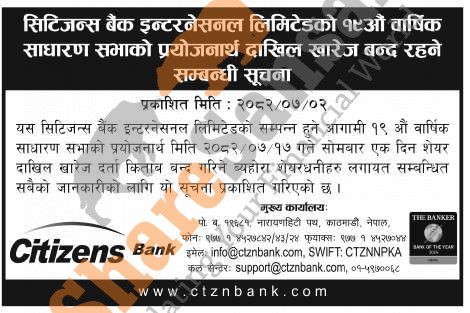 Citizens Bank International Limited has published a book closure date for its upcoming 19th AGM.