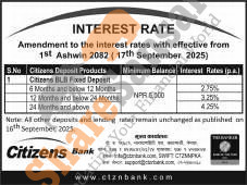 Citizens Bank International Limited has published a notice regarding correction on its interest rate for deposit which was published on 31st Bhadra, 2082.