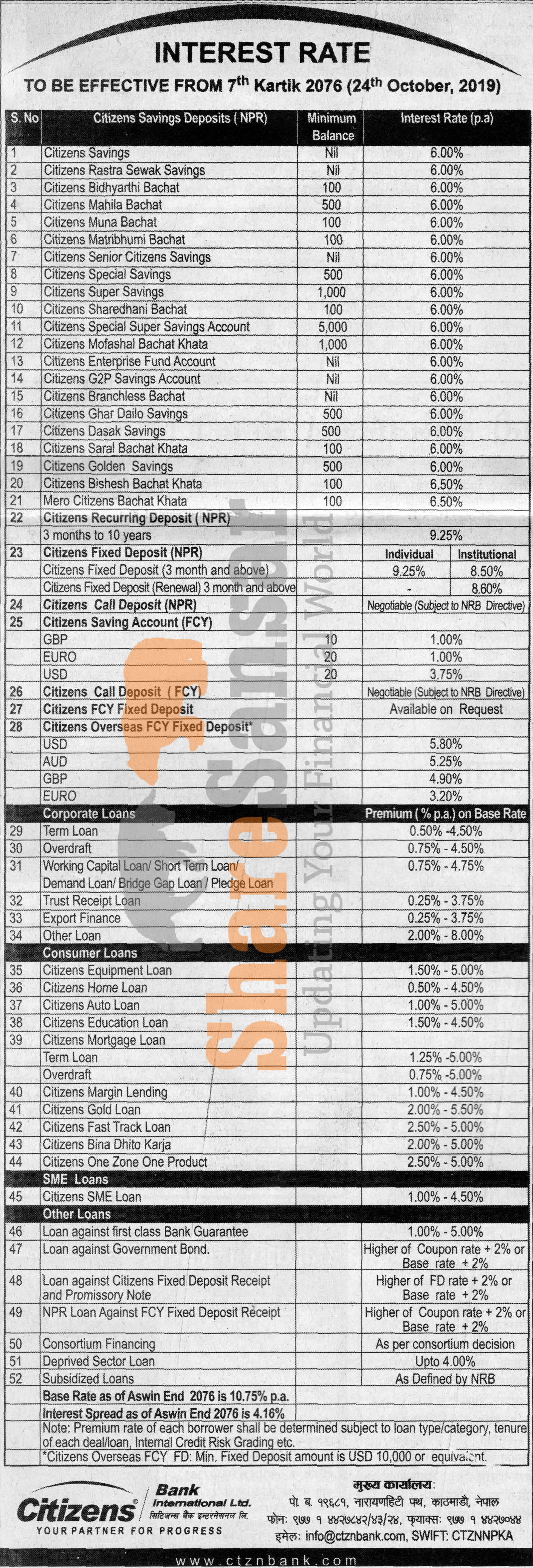 Citizens Bank International Limited has published a notice regarding new interest rate and its effective from 7th Kartik, 2076.