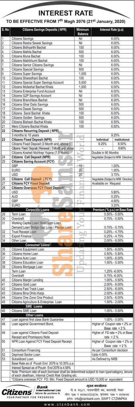 Citizens Bank International Limited has published a notice regarding new interest rate and its effective from 7th Magh, 2076.