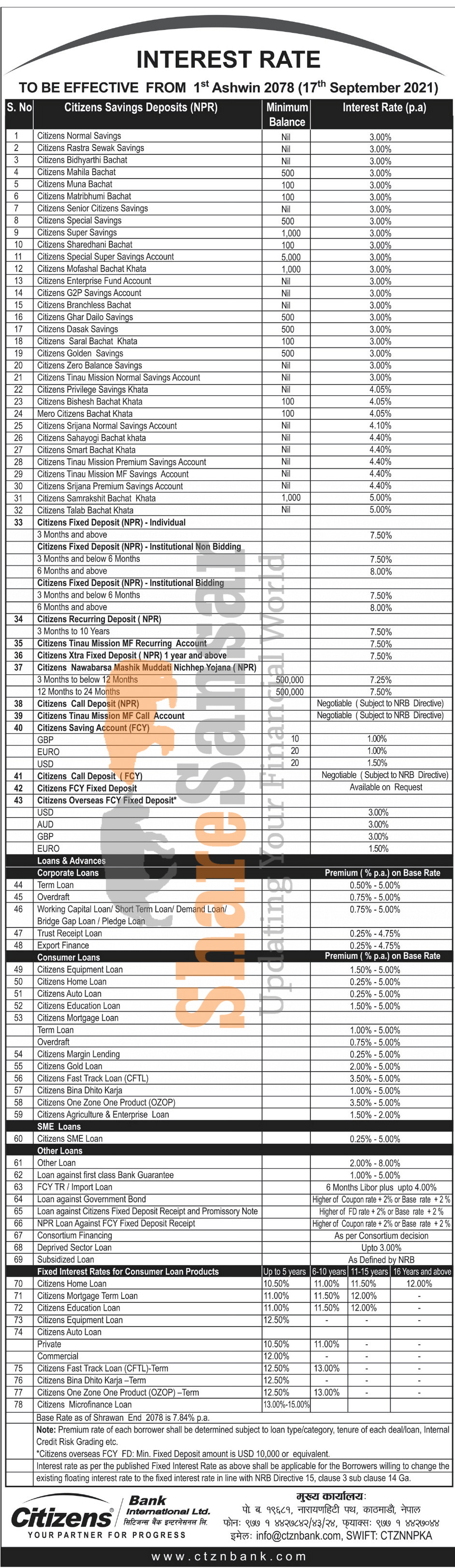 Citizens Bank International Limited has published a notice regarding the new interest rate for deposit and loan products and it's effective from 1st Ashwin, 2078.